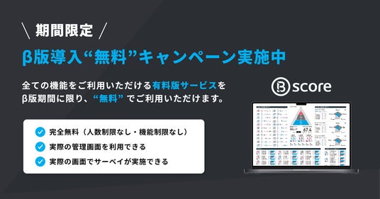 企業のブランディング支援を行うトゥモローゲート株式会社(本社:大阪府大阪市、代表取締役:西崎 康平)は、ブランド力を可視化し、組織課題を把握・分析するためのサーベイツール「B-SCORE」のβ版をリリースしたことをお知らせします。また、リリースに伴って、β版導入”無料”キャンペーンを実施いたします。