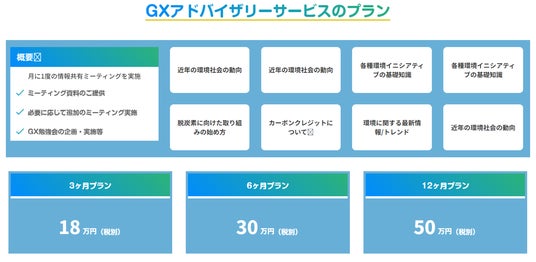 GXアドバイザリーサービスは毎月定額でミーティングを実施し、お客様の会社状況を踏まえた環境への取り組みに関するアドバイスや最新トレンドの共有、勉強会などを実施するサービスです。