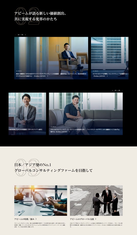 3.世界観を伝えるデザインへの刷新 アビームコンサルティングが大切にしている価値観や目指していきたい未来像を、ブランドカラーを基調としたダイナミックかつスマートなデザインで表現。ブランドページを刷新し、クライアントと共に取り組む価値共創や、それを支えるプロフェッショナルたち、アビームコンサルティングの想いや企業活動としての取り組みについて紹介しています。