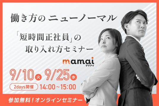 株式会社ユニークピース(本社:東京都中央区/代表取締役:池本博則)は、“ママの働く”に特化した人材総合サービス「ママアイ」において、企業の人事・採用担当者向けの「失敗しない“短時間正社員”の取り入れ方セミナー」を、2024年9月10日(火)、9月25日(水)の2日間、開催します。本セミナーは、ライブ配信によるオンライン開催、参加費無料にてご参加いただけます。