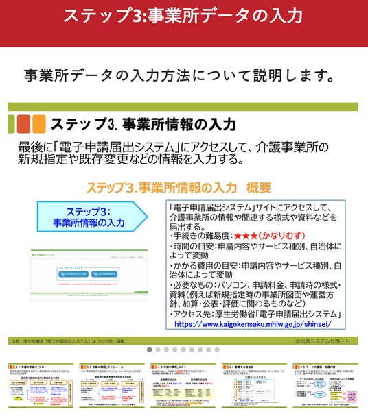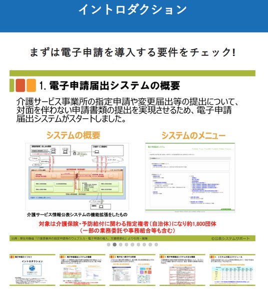 ・主な内容:電子申請&公表システムを解説するコンテンツ、自治体や介護事業所向けコラム、関連するトピックスや参考事例など