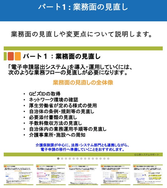 ・説明コンテンツ:事業所向けサポートプランの、解説スライドや操作手順の動画などの提供