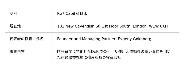 2. Re7について Re7は、英国(ロンドン)に拠点を置く暗号資産投資会社であり、分散型金融による利回り、および流動性の高いアルファ戦略[1]を専門としており、高度なアルゴリズム、独自のリスク管理手法および伝統金融の基準に合致した強固なコンプライアンスプロセスを活用するなど、洗礼された暗号資産投資戦略と実績で知られております。