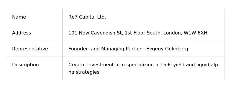2. About Re7 Capital LtdBased in London, UK, Re7 is a crypto asset investment firm specializing in decentralized finance (DeFi) yields and high-liquidity alpha strategies. The firm is renowned for its sophisticated crypto investment strategies and proven track record, utilizing advanced algorithms, proprietary risk management techniques, and robust compliance processes that meet traditional financial standards.