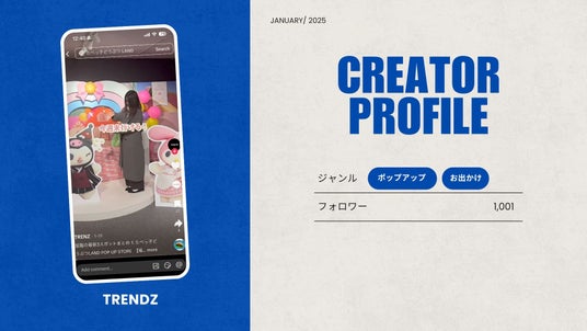 「TRENDZ」は、企業やブランドのポップアップイベントを中心に取材を行い、動画の制作・発信をしています。これまでの投稿の中には、再生回数15万回を超える動画も。お出かけ分野に強みを持つ同メディアの加盟により、お出かけスポットやポップアップの認知・集客拡大が期待できます。