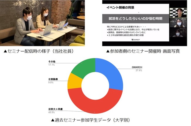 当社はこれまで、コロナ禍で激しく変化する採用市場に適応すべく、スタートアップや中小企業へのリモートワーク導入やオンライン採用活動の支援を行ってきました。また、オンラインでの学生向けセミナーも数多く実施してまいりました。オンライン就活セミナーには、全国各地から総計200名近くの就活生がリモートで参加しており、 毎回高評価をいただく内容となっています。 これまでWEBやテレビなどメディアにも多数取り上げられています。