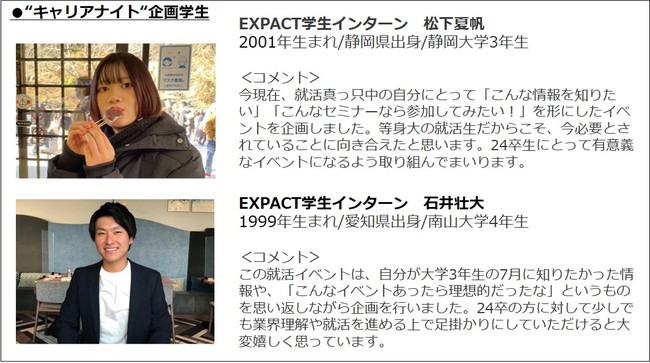 静岡県を中心に全国のスタートアップ企業等の採用支援業務などを展開するEXPACT株式会社(静岡県浜松市中区、代表取締役 高地 耕平)は、学生が企画する選考直結型就活セミナー「キャリアナイト(全4回)」を、オンラインにて開催いたします。