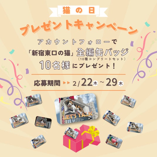 株式会社クロススペース(本社:東京都新宿区、代表者:森田 威)が運営する、クロス新宿ビジョンの公式Instagramでは、2月22日(木)の「猫の日」を祝して、Instagramをフォローした方から抽選で10名様に、メインキャラクター『新宿東口の猫』の缶バッジが10種コンプリートセットで当たるキャンペーンを行います。