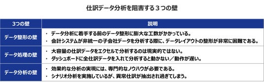 既に仕訳データ分析に取り組んでいる先進企業においても、主に以下の「3つの壁」が障壁となり、グループ子会社分析の効果や効率性に課題を抱えているという声が多く聞かれます。