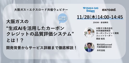 “カーボンクレジット・排出量取引制度 オールインワン情報サービス”を提供する株式会社exroad(エクスロード)と大阪ガス株式会社の共催ウェビナーです。