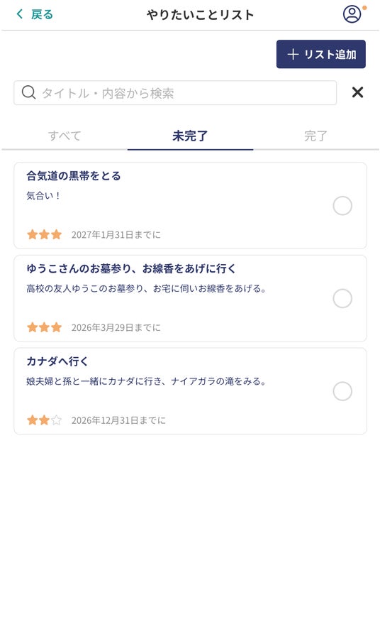 遺言ネットの「やりたいことリスト」は、日々の生活の中で生まれる「やりたいこと」や「叶えたいこと」を記録するウィッシュリストツールです。入力すると、ユーザー自身が設定した優先度順で表示されます。「やりたいことリスト」によって、「いつかやろう」と曖昧になっていた願いが「今、叶えるべきこと」として明確となり、未来へ一歩踏み出す勇気を与えてくれます。