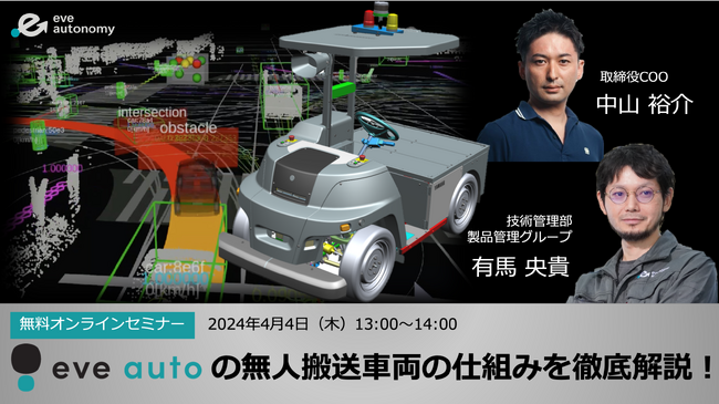 株式会社eve autonomy(イブ・オートノミー、静岡県袋井市、代表取締役:星野 亮介、以下「eve autonomy」)は、2024年4月4日木曜日に、第2回の自主開催となる無料オンラインセミナー「eve autoの無人搬送車両の仕組みを徹底解説!」を行います。