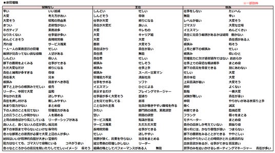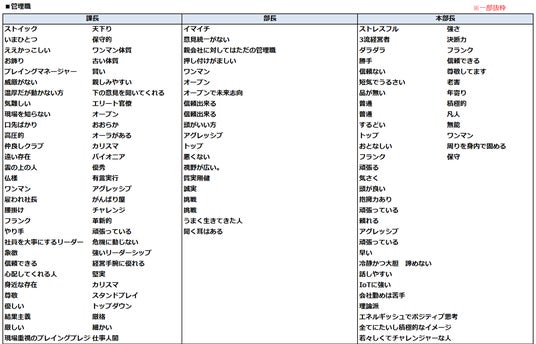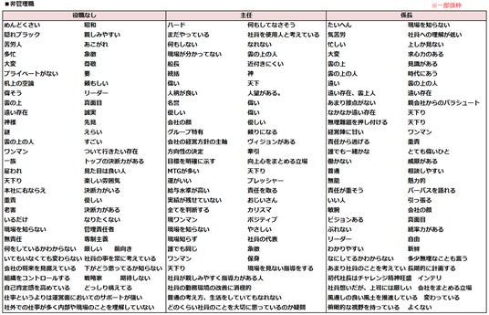 ■<調査トピックス5.>社長のイメージについては管理職に対するイメージに比べ、役職関係なく「尊敬」「優しい」「統率力がある」といったポジティブな回答が比較的多く見られた