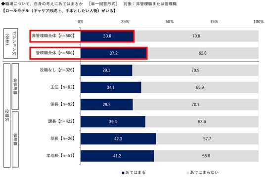 「職場にロールモデル(キャリア形成上、手本としたい人物)がいる」と回答した人は非管理職/管理職ともに30%台。ポジション別に見ても50%を切る結果に■<調査トピックス3.>非管理職(役職なし326人、主任82人、係長92人、計500人)および管理職(課長423人、部長26人、本部長51人、計500人)に、職場にロールモデル(キャリア形成上、手本としたい人物)がいるかを聞いたところ、「あてはまる(いる)」と回答した非管理職は30.0%、管理職は37.2%だった