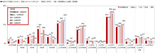 ・「部長」に就くとした場合の希望年収も役職による大きな差はなく、「1,500万円前後(平均値)」であった