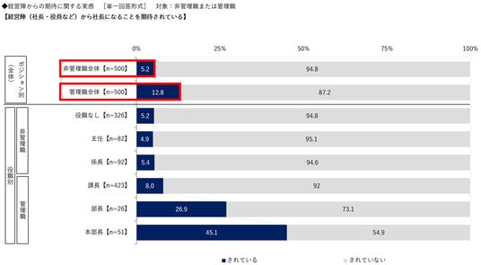 ・「経営陣(社長・役員など)から社長になることを期待されている」と回答した非管理職は5%、管理職は12%となった