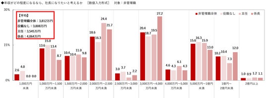 「社長」に就くとした場合の年収について、各役職3,500万円以上を希望。部長においては希望年収 6,000万円超(平均値)■<調査トピックス6.>「社長職」の希望年収を、非管理職(役職なし326人、主任82人、係長92人、計500人)および管理職(課長423人、部長26人、本部長51人、計500人)に聞いたところ、 非管理職は平均「3,812万円」、管理職は平均「4,588万円」を希望すると回答した<非管理職>
