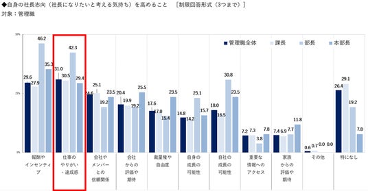 ・管理職を役職別に見た場合の1位は、課長「仕事のやりがい・達成感(30.5%)」、部長および本部長「報酬やインセンティブ(順に46.2%・35.3%)」