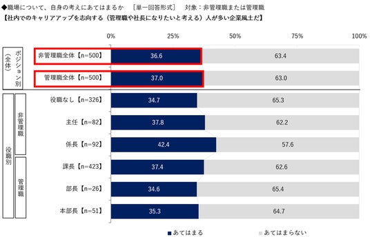 社内の企業風土について、「キャリアアップを志向する(管理職や社長になりたいと考える)人が多い」と考える人は、非管理職/管理職ともに30%台■<調査トピックス4.>非管理職(役職なし326人、主任82人、係長92人、計500人)および管理職(課長423人、部長26人、本部長51人、計500人)にキャリアアップを志向する人(管理職や社長になりたいと考える人)が社内に多いかを聞いたところ、「あてはまる(いる)」と回答した非管理職は36.6%、管理職は37.0%だった