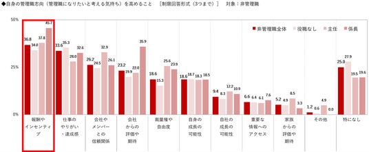 ・「社長志向を高めること」と同様に、管理職志向の方でも1位は「報酬やインセンティブ」が気持ちを高める要因の1位となった