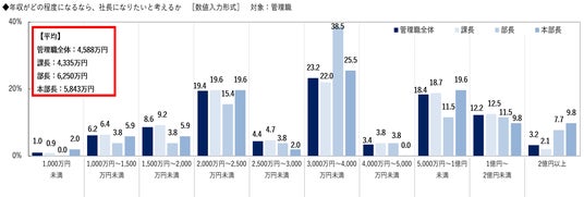 ・「部長」に就くとした場合の希望年収も役職による大きな差はなく「1,500万円前後(平均値)」