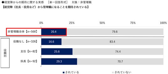 「経営陣(社長・役員など)から管理職になることを期待されている」と回答した非管理職はわずか20.4%。管理職手前の係長でさえも30%を切る結果に■<調査トピックス1.>非管理職(役職なし326人、主任82人、係長92人、計500人)にキャリアアップ・昇進の意向や、経営陣からの期待について聞いたところ、「経営陣から管理職になることを期待されている」と回答した人は、20.4%という結果となった