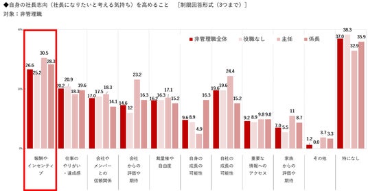・非管理職を役職別に見た場合の1位は、役職なし・主任・係長ともに「報酬やインセンティブ(順に25.2%・30.5%・28.3%)」