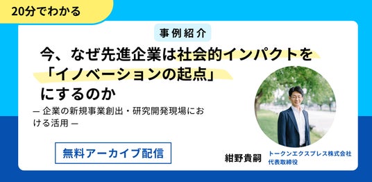 ダウンロードはコチラ:https://lp.token-express.com/wp2602■セミナーアーカイブのご案内「今なぜ先進企業は、社会的インパクトを”イノベーションの起点”にするのか ― 企業の新規事業創出・研究開発現場における活用 ―」をテーマにセミナーアーカイブを配信中です。ご興味ある方は是非お申込みください。