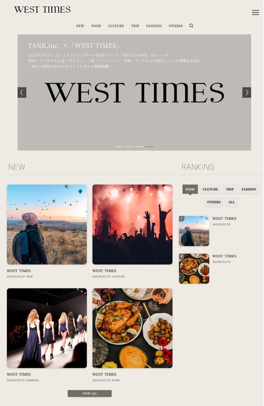 株式会社TANK(東京都渋谷区神宮前6-33-5 マンション原宿402 代表取締役:今井雄一)は2025年2月1日(土)に、親しみのある、かつ、洗練された情報をお届けするライフスタイルWEBメディア【WEST TIMES】をローンチします。