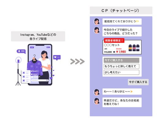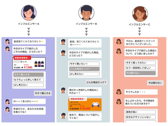 CPは、インフルエンサーやVTuberとの連動機能を搭載しており※2、ライブコマースイベントなどから流入したユーザーに対して一貫したブランド体験を提供します。例えば、インスタライブやYouTubeライブで紹介された後、ユーザーがCPにアクセスすると、流入元に応じたアイコンや会話のトーンが自動で調整され、親しみやすい体験が実現します。さらに、複数のインフルエンサーに対応するため、流入元を自動的に判定し、1つのボットでアイコンのインフルエンサーや、口調を変更します。この機能により、プロモーションの一貫性を維持しつつ、パーソナライズされた体験を提供できます。
