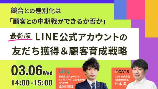 CATS株式会社(本社:東京都新宿区、代表取締役社長:松本 勇)は、3月6日(水)14:00~15:00にLINEマーケティング担当者向けの共催セミナーを開催いたします。