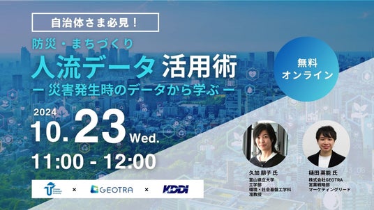 富山県立大学、KDDIと連携し、人流データ×防災・まちづくりをテーマにセミナーを実施いたします。本セミナーでは、地震発生時の課題解決に向け、人流データ活用した研究を進めている富山県立大学 久加様にご登壇いただき、現時点での成果についてお話いただきます。また、KDDIグループの人流データ活用事例や今後の可能性についてもご説明いたします。