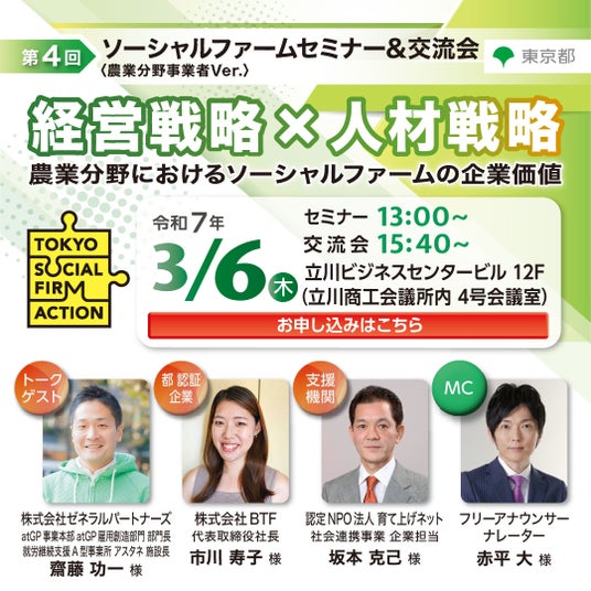 本セミナーでは、東京都が認証したソーシャルファーム企業の経営者が自社の事例から得た、障がいのある方・引きこもり経験がある方・ひとり親の方・刑余者などで、さまざまな理由から働くことに困難を抱えている方の雇用・定着、働きやすい環境の整備の他、経営課題の解決や自律的経営の実現といったノウハウをご紹介します。