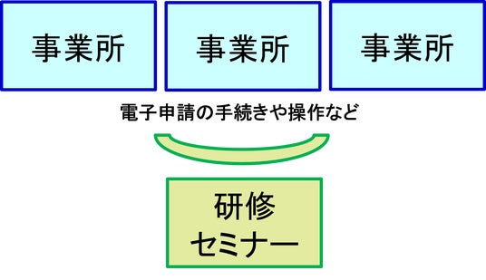 :電子申請の手続きや操作に関するセミナーを、地域ごとの介護事業所向けの団体研修として説明します。