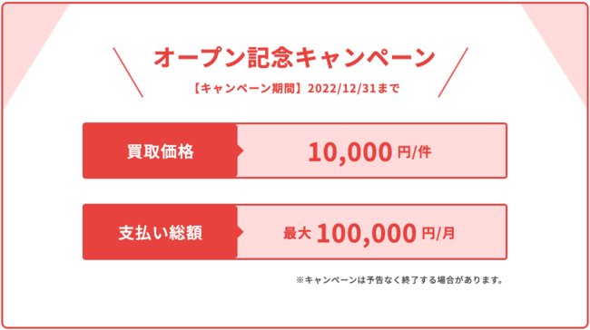 サービスリリースにあわせて、『オープン記念キャンペーン』としてお問い合わせを10,000円/件で買取いたします。