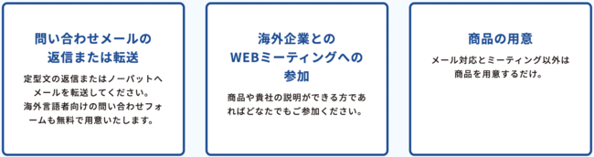 本サービスを利用することで日本国内メーカーはコストをかけずに言語や人材、時間、商習慣などを理由に対応できていない問い合わせを売上につなげることができ、1件の問い合わせも無駄にすることなく営業活動を行うことが可能となります。