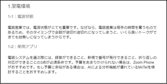 例えば、「架電に適した環境」では電話営業に向いているアプリの選び方やヘッドセットなど、電話営業を始める前に準備しておきたい項目から詳しく解説します。