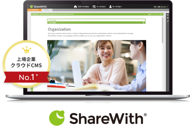 ShareWith(R)は、コーポレートサイトに必要なCMS・サーバー&セキュリティ・サポートをワンパッケージで提供し、持続的なサイト運営を実現する、定額制のクラウドサービス「コーポレートサイト・クラウド」です。広報・IR・採用・ESG・製品サービスなど、部門横断で運営されるコーポレートサイトは、運営の属人化やシステムの複雑化が起きやすい特徴があります。ShareWith(R)は、コーポレートサイトにフィットするよう開発されているため、従来CMSでは常識だったカスタマイズを不要にし、学習コストをかけず、誰でもすぐに運営に参加できる「ひとつのプラットフォーム」を提供。運営メンバーをエンパワーし、コーポレートサイトの持続的運営を実現します。