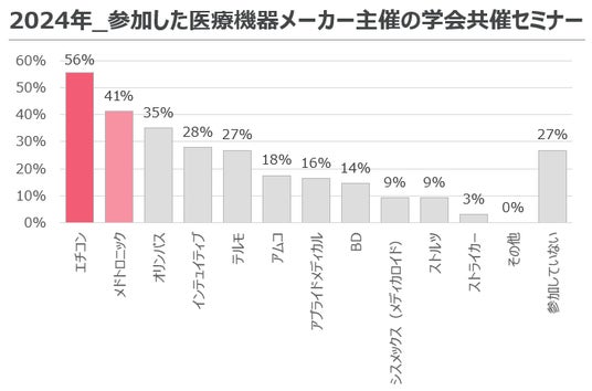 結果は1位「エチコン」が56%、2位「メドトロニック」が41%、3位「オリンパス」が35%、4位「インテュイティブ」が28%、5位「テルモ」が27%、6位「アムコ」が18%、次いでアプライドメディカル、BD、シスメックス(メディカロイド)、ストルツ、ストライカーという順になった。2023年と比較した参加頻度は平均で約10%増加した。