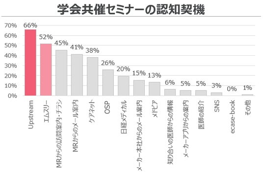 医療機器メーカー主催の学会共催セミナー、参加の認知契機はアップストリームが66%と最も高く、52%のエムスリー、45%のMRからの案内と続く。