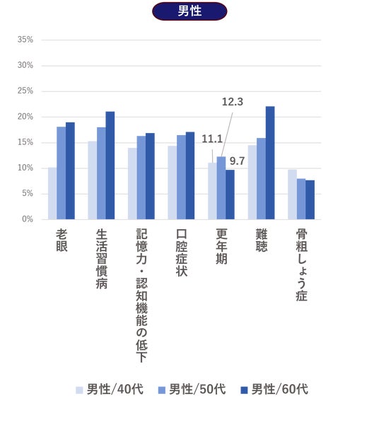 ・性別で見ると、男性は女性よりも「生活習慣病」が6.1ポイント高かった。女性は男性よりも「更年期」が14.3ポイント、「骨粗しょう症」が11.1ポイント高かった。女性の更年期については、40代、50代で症状を感じる人が多い結果となった。