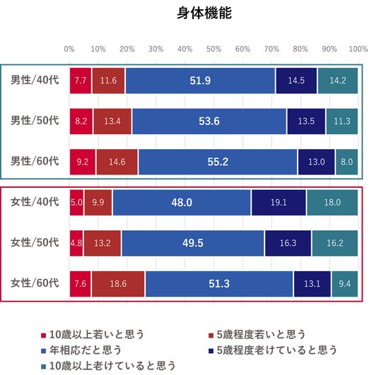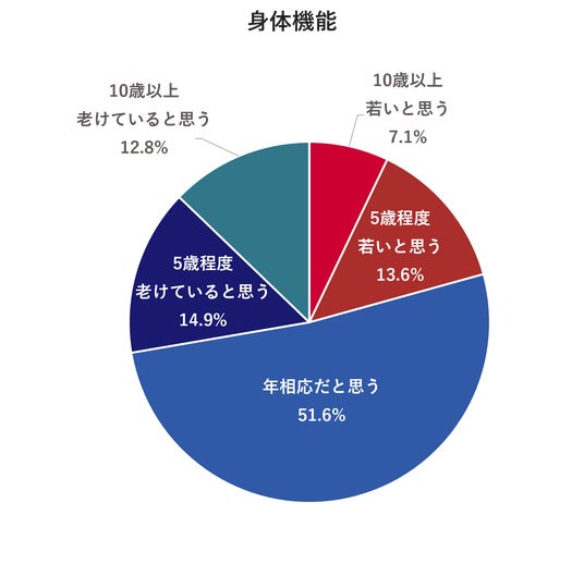 ・自身の身体機能についても、「年相応だと思う」との回答が約半数だった。見た目と異なり、実年齢より老けていると感じている割合が高く、「5歳程度老けていると思う」「10歳以上老けていると思う」と回答した人は27.7%だった。中でも40代の女性が身体の衰えを感じている割合が高かった。現在の健康状態に関する問い(*1)において、女性の40代、50代で「更年期」が高かったことから、更年期の身体の変化を感じている可能性が考えられる。