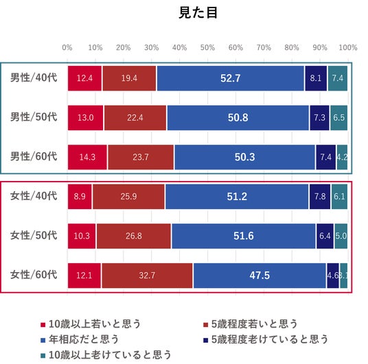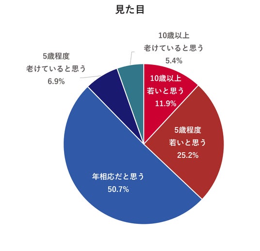 見た目現在感じている症状で、髪の毛や肌の変化などの容姿に関するものとして、「白髪」が最も高く約5割、「シミ」「しわ」「たるみ」が約3割となった。自身の見た目について、実年齢を比較して若いと感じている人は4割近かった。容姿に変化を感じつつも、見た目の若さを感じている人も一定数いることが伺えた。