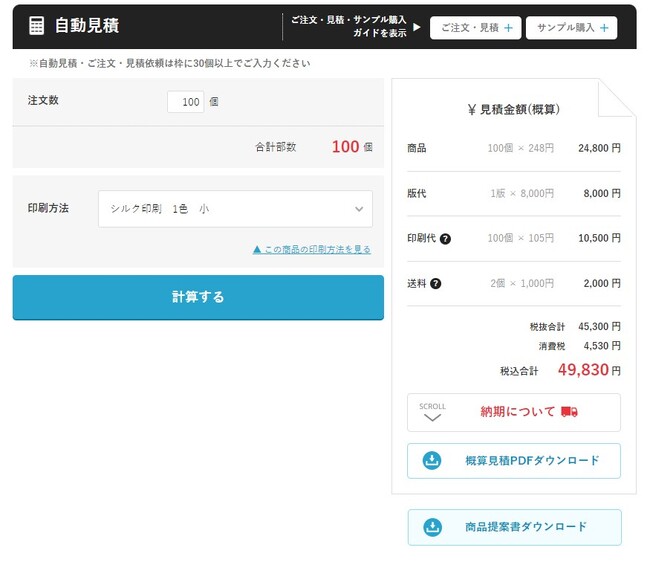 各商品ページには自動見積もり機能がついています。会員登録不要で、すぐに総額がわかるから、急な打ち合わせで見積もりが必要な場合でも安心!自動見積もりはPDFで保存・印刷が可能です。