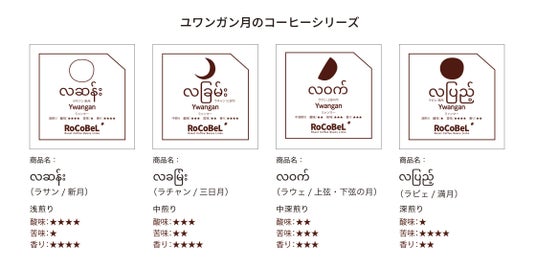 そこで、2024年10月からロコベル がこれまでの「フィジビリティ・スタディ(実証実験)のフェーズ」から「ビジネスへの移行フェーズ」に切り替わったことを機に、新商品を企画。深煎りしたミャンマー(ユワンガン)の豆「ラピェ(満月)」に、ホンジュラス、コロンビア、タンザニア(一般にはキリマンジェロと呼ばれています)をそれぞれ深煎りにしてブレンドした新しいブレンドコーヒーを発売することにしました。