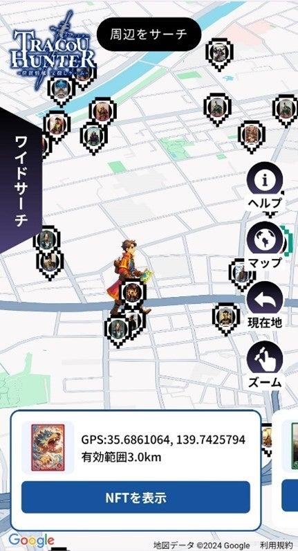 本サービスは、トレーディングカードの要素とGPS機能を活用し、実世界の位置情報をトリガーにNFTトレカ型クーポンの「トレクー」が受け取れる、宝探し感覚のデジタルマップサービスです。