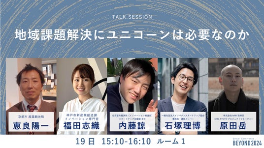 2020年スタートアップエコシステム拠点都市の選定がなされ、「ユニコーン創出」を様々な自治体が掲げてからはや4年。本トークではその目標の是非を問い、スタートアップ支援は真に地域課題の解決に寄与しているのか、ユニコーンは地域の発展に本当に必要なのかを模索します。また、公共性の高いソーシャルスタートアップが多数生まれる昨今において、自治体とスタートアップとの連携が進まない背景および課題を深掘り、新たな出口を議論します。