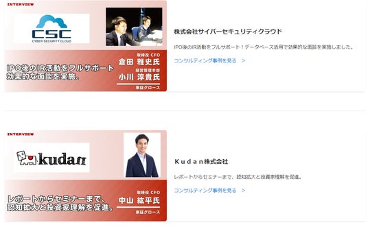 当社では100社超の上場企業のIRコンサルティング・支援をしております。具体的な事例と、IRご担当者様から頂いた声をご紹介しています。