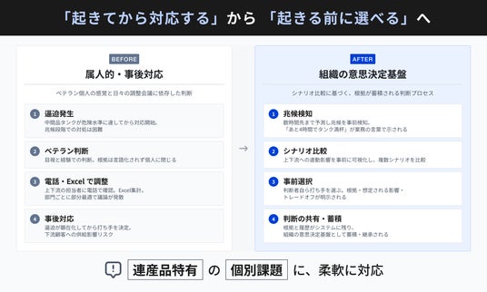 数式やグラフではなく、「あと4時間でタンク満杯」「下流Aへの供給を絞ると上流Bが2時間後に過剰生産」といった業務の言葉で状況を示し、複数のシナリオを事前に比較検討できる環境を構築します。判断者が自ら打ち手を「選べる」状態を作ることに注力しています。
