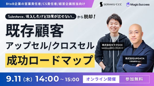 既存顧客支援を促進する「MagicSuccess(マジックサクセス)」を提供するUPDATAと、Salesforceをはじめとするシステム定着・活用支援を行うセラクCCCによる、対談ウェビナー